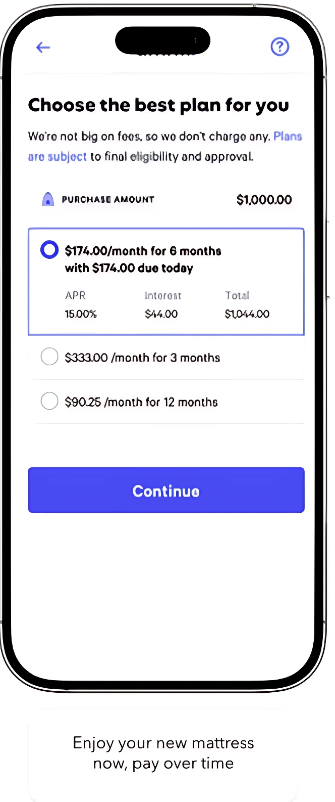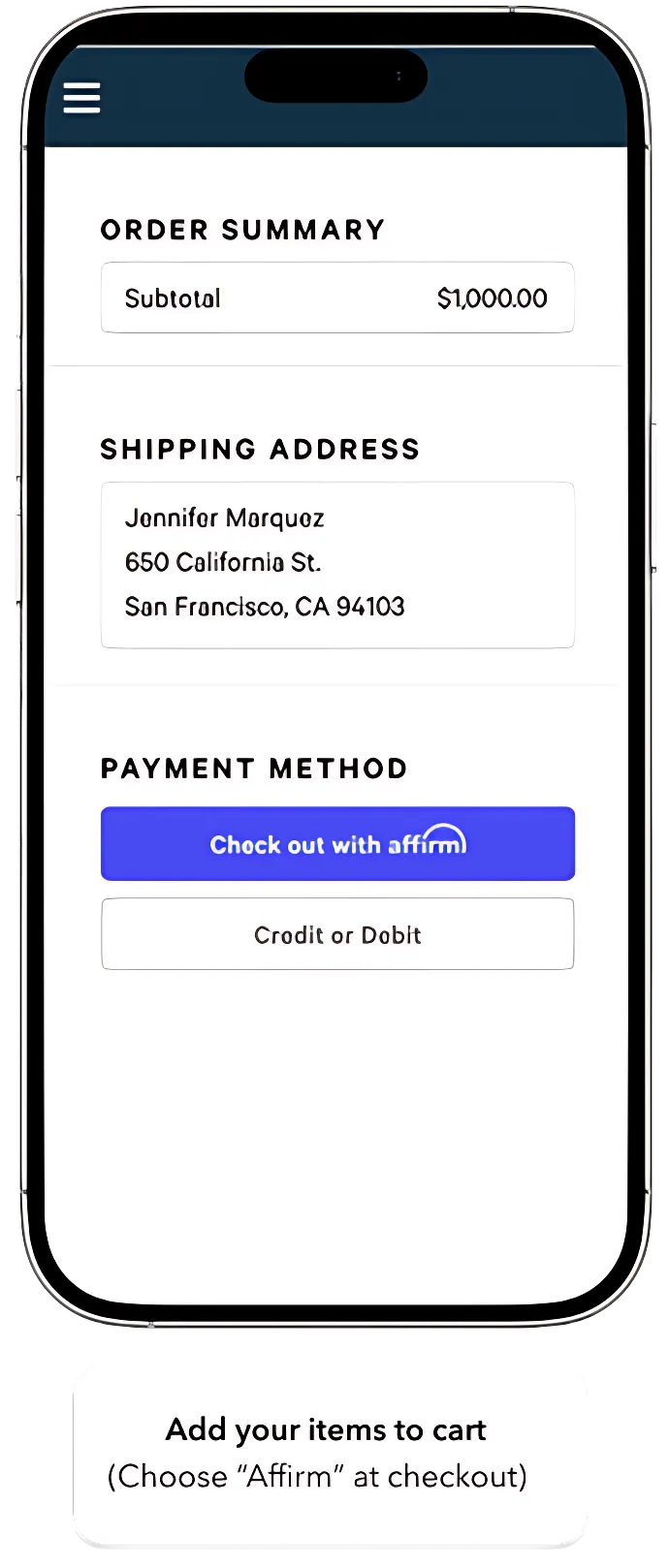 Your rate will be 0% APR or 10–36% APR based on credit, and is subject to an eligibility check. Affirm does not charge late fees, service fees, prepayment fees, APR penalties or any other hidden fees for a late payment.